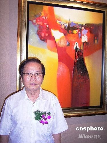 5月30日上午,琼籍台湾著名油画家陈显栋先生"八十回顾展"在海口开幕.图为陈先生和最新创作的代表画作合影。陈显栋1930年生于海南,19岁赴台,毕业于台北复兴岗学院艺术系。1961年参加“巴西圣保罗双年展”,跻身台湾画家行列。两年后“沉寂”,二十余年间,潜心研究媒材和技法,1985年以迥异于过往的画风复出。他的画作多表现大自然,缤纷的色彩、创新的“画膜”材质和匠心独具的构图,被称为站在东西文化交汇点上的现代油画家,表现出“具有人性亲切感的诗象境界”。 中新社发 王辛莉 摄