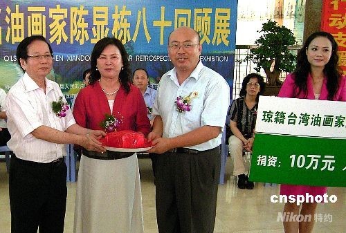 5月30日上午,琼籍台湾著名油画家陈显栋先生(左一)在椰城举行的"八十回顾展"开幕式上,通过海南省红十字会向四川汶川中学捐赠十万元人民币现金,支援灾区重建。 中新社发 马浩楠 摄