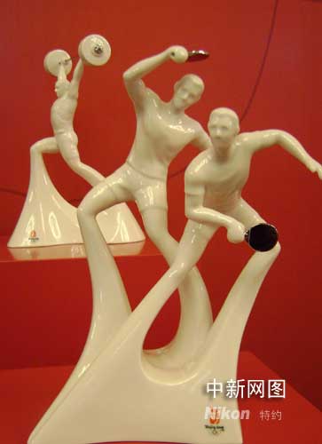 法蓝瓷创造的2008北京奥运运动员摆饰艺品,以纯白陶瓷面貌呈现。包括篮球、手球、田径、乒乓球、皮划艇、帆船、羽毛球、花游、射箭、马术、排球、曲棍球等29个项目,以精湛的制瓷技术,令运动选手们的绝妙风采,跃然瓷上。