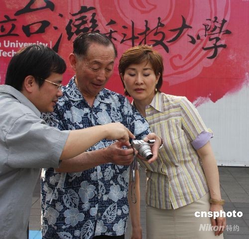 京剧大师梅兰芳之子梅葆玖(中)第三次访问台湾,六月二十一日应邀由台湾女弟子魏海敏(右)陪同在台北科技大学演讲。演讲后,喜好摄影的梅先生拿出“莱卡”相机,请弟子欣赏自己拍摄的校园风景。 中新社发 耿军 摄