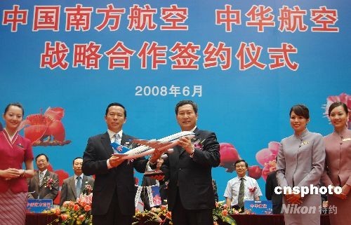 6月23日,在两岸周末包机即将开启之际,大陆最大的航空公司中国南方航空公司与台湾最大的航空公司中华航空公司在广州签署战略合作备忘录,并宣布为两岸同胞提供更便利、更优质的周末包机服务。图为南航董事长刘绍勇(左二)与华航董事长赵国帅(左三)签署备忘录并互赠纪念品。 中新社发 柯小军 摄
