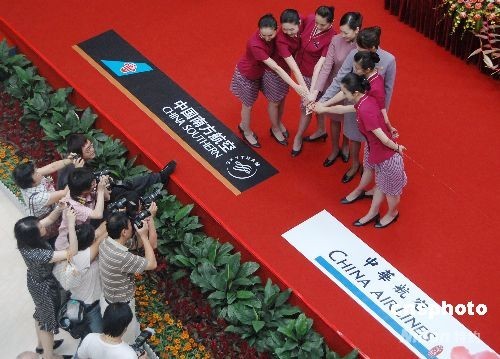 6月23日,在两岸周末包机即将开启之际,大陆最大的航空公司中国南方航空公司与台湾最大的航空公司中华航空公司在广州签署战略合作备忘录,并宣布为两岸同胞提供更便利、更优质的周末包机服务。图为两家航空公司的空姐携起手来,以示将为两岸同胞提供更优质的服务。 中新社发 柯小军 摄