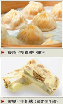台北飞大陆的旅客,则可吃到北京味的鸡米锁双龙、北京烤鸭,上海名菜虾仔乌参、广式芝麻枣泥核桃酥等。