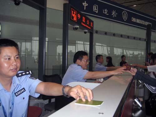 北京出入境边防检查总站边检二队民警正在为台湾旅客办理入境手续。