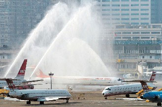 台北松山机场立荣航空首班飞往上海包机上午8点7分出发,台北航站以水柱喷洒欢送。台湾《联合晚报》记者游顺然摄
