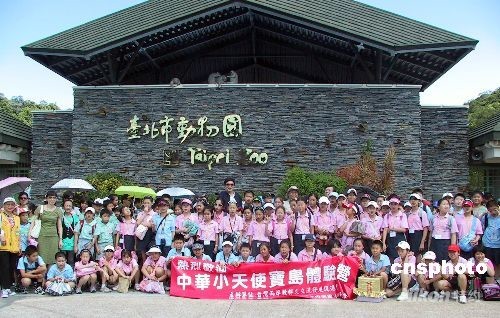 来自北京中关村第三小学的近百位“中华小天使”七月十五日在台湾展开宝岛夏令营行程,创下两岸儿童交流人数最多的纪录。此次来台的小朋友平均年龄在十一岁左右,由十六位老师带领,他们于十四日抵达台湾,在台行程九天八夜。图为在参观台北市立动物园前合影。 中新社发 徐长安 摄