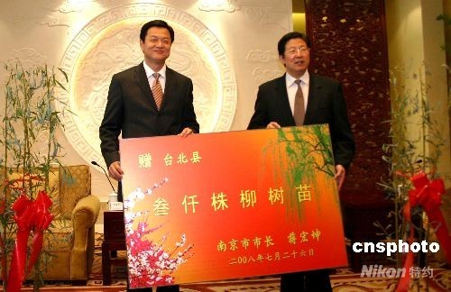 七月二十六日,南京市官员会见台北县长周锡玮一行十人,并向其赠送三千棵柳树、一幅巨型云锦作礼物。台北县南京参访团于二十五日晚间抵达南京,展开为期五天的访问。 中新社发 朱晓颖 摄