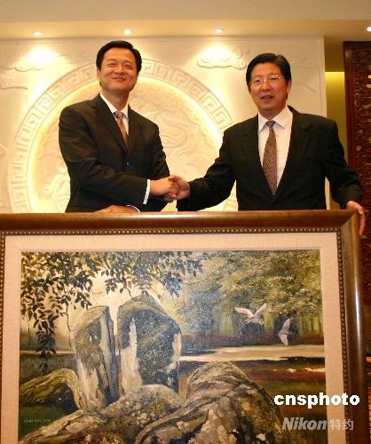 七月二十六日,台北县长周锡玮一行与南京市官员会见。周锡玮将一幅自创油画作为回赠给南京,上绘有一双鹭鸶、一对奇石,象征成双成对,意味两岸前景。 中新社发 朱晓颖 摄