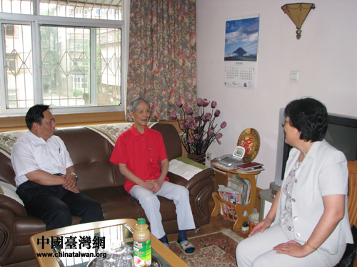 全国台联梁国扬会长与河南省台联会长郭晴看望在郑老台胞。(图片来源:河南省台办)