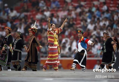 8月8日,第29届夏季奥运会在北京奥林匹克公园内的国家体育场“鸟巢”举行。来自台湾的高金素梅文化团队在“鸟巢”表演“我们都是一家人”歌舞。 中新社发 杜洋 摄