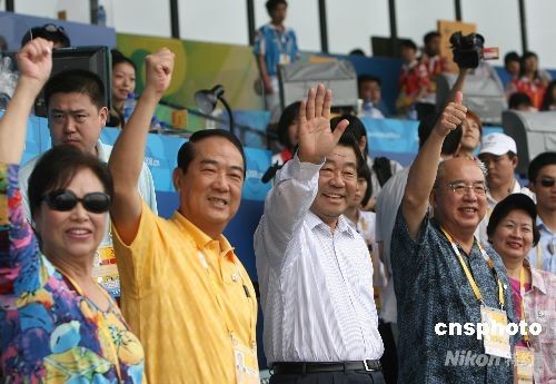8月13日,北京奥运会棒球比赛揭幕战在中华台北队和荷兰队之间举行,中共中央政治局常委贾庆林与中国国民党主席吴伯雄、亲民党主席宋楚瑜到现场观战,共同为中华台北棒球队加油。 中新社发 武仲林 摄