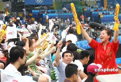 8月13日,2008北京奥运棒球赛在五棵松体育中心举行,北京球迷拿着加油棒大声喊“中华台北加油”。 中新社发 CNAsports 摄