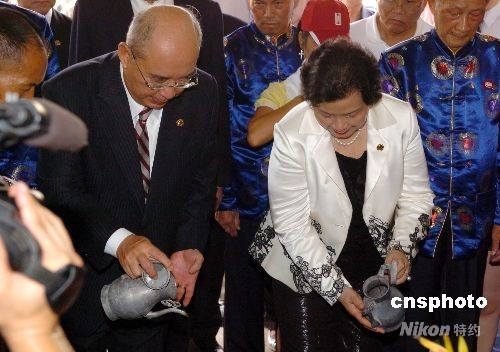 8月14日,中国国民党主席吴伯雄夫妇时隔8年,第2次回到祖籍地——福建永定县下洋震思贤村谒祖,在有着500多年历史,奉祀开基祖吴纲公的吴氏宗祠里举行了一个简短而隆重的祭祀仪式。图为吴伯雄夫妇在宗祠里洒酒,向祖先表示祭奠。 中新社发 游庆辉 摄