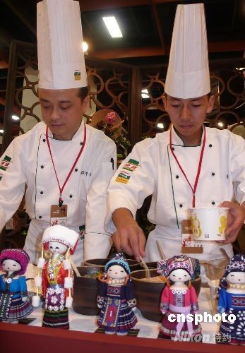 “二00八台湾美食展”八月十五日在台北开幕。来自贵州的黔菜展区,展示了贵州菜“丝娃娃”、苗家酸鱼汤等十二道菜,贵州师傅徐静松、袁平还现场示范制作红油米豆腐、糕粑稀饭,让观众见识辣、酸、鲜、野的黔菜风味。 中新社发 曾嘉 摄