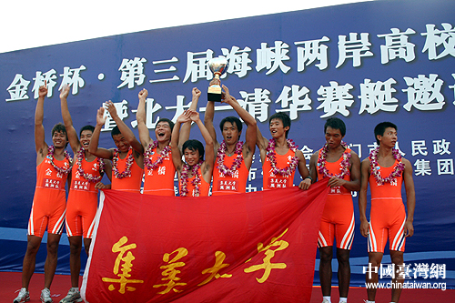 中国台湾网8月30日厦门消息 “金桥杯”第三届海峡两岸高校赛艇挑战赛暨北大—清华赛艇邀请赛今天下午举行,厦门集美大学以8分32秒37蝉联冠军,第二次参赛的台湾辅仁大学以8分39秒07排名第二。两队成绩均比去年有不少提高。同时举办的北大清华赛艇邀请赛,因率先冲过终点的清华大学被判违规,北大意外蝉联冠军。