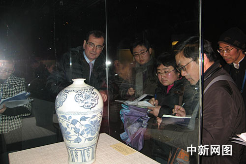 图为台北鸿禧美术馆馆长詹姆斯·史彬士介绍元代青花牡丹纹梅瓶。作 者:艾启平