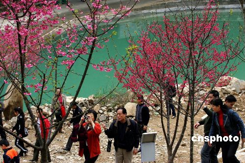 一月三十一日,台湾樱花绽放在福州国家森林公园樱花园,与新建成的水体景观碧绿湖水相映衬,吸引许多游客前来在观赏樱花、拍照留影。中新社发 杨婀娜 摄