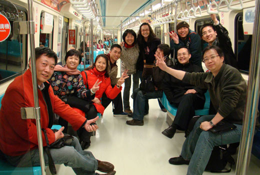 图为除夕之夜,大陆驻台记者在采访归来的捷运列车内合影留念。图为新华社记者李凯、王妍,人民日报驻台记者吴亚明、陈晓星,中央人民广播电台记者张浩、谢治国,中央电视台记者殷捷、陈轩石,东南卫视记者叶青林、黄晟,福建日报记者林娟、翁之光。
