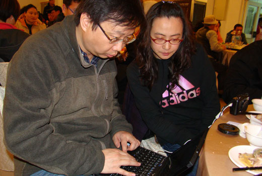 这次"赴台旅游两岸除夕围炉联欢晚会"活动是由台湾旅行商业同业公会全联会举办的。一走进举办活动的餐馆就被温暖热烈的气氛所包围,主要来自北京和上海的大陆游客表演着节目,并和台湾同胞热烈的互动。而李凯和我无暇顾及"围炉夜话"、看演出,纷纷拿起摄像机和照相机在场内四处穿梭拍摄、采访大陆游客来台过年的感受。拍好后再迅速"归位",当即就在饭桌上发起稿来,中央人民广播电台的驻台记者张浩无不感慨地说:"新华社记者真敬业啊!",并拿起相机拍下我们除夕之夜的"工作照",记录下这一难忘的一瞬间。