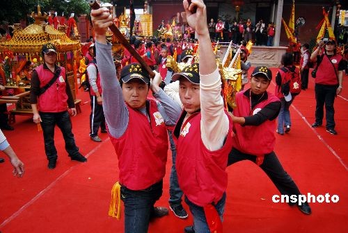 中新社东山二月十七日电 (谢汉杰)二月十七日,由台湾嘉义市天后宫牵头组织的全岛二十六家妈祖宫庙的六百五十名台胞信众组成的进香团,在海峡两岸神缘祖庙福建省东山岛铜钵村妈祖庙(净山名院)举行隆重的祭祖典祀、诵经祈福等活动。