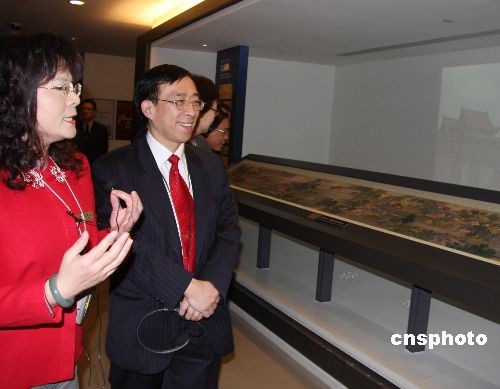 2月26日,上海博物馆馆长陈燮君(中)一行应邀抵达台北参访。图为陈燮君一行在台北故宫参观,听工作人员介绍结合了声光效果的《清明上河图》复制品。 中新社发 路梅 摄