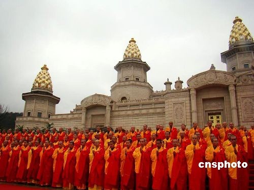 2008年十一月二十三日上午,无锡、香港、高雄三地同时响起了庄严深沉、悠远绵长的祈福钟声。两岸三地佛教界同时宣布:第二届世界佛教论坛将在海峡两岸举行,明年三月二十八日至四月一日在无锡开幕,台北闭幕。 中新社发 丁梅 摄