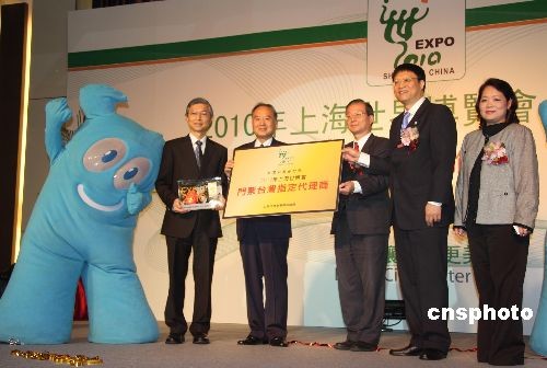 “二0一0年上海世界博览会推介会”于四月六日在台北举行。台湾“中国旅行社”被宣布成为上海世博会台湾地区门票的指定代理商,上海世博会的吉祥物“海宝”及票样亦首次在台湾亮相。图为上海世博会事务协调局副局长陈先进(右二)在台北推介会上,向台湾地区门票指定代理商台湾“中国旅行社”董事长周庆雄(左二)赠门票、授匾牌。 中新社发 耿军 摄