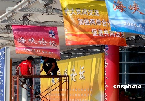5月14日,厦门海峡会议中心工作人员在加紧布置会场内外,迎接前来参加5月17日在厦门开幕的“海峡论坛”的八千名台胞。 中新社发 傅丹丹 摄