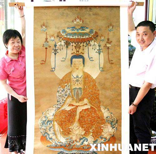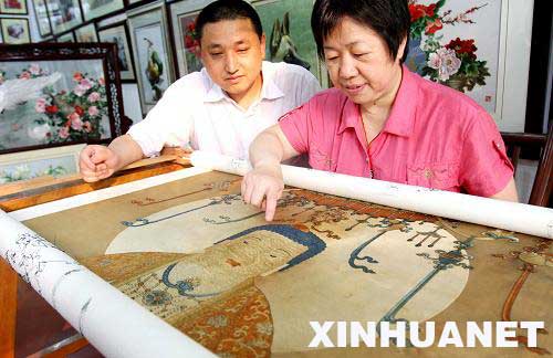6月4日下午,苏州绣娘卢招娣与其丈夫展示修复后的明代“释迦牟尼佛绣像”。当日,苏州绣娘卢招娣将一幅台湾民间珍藏的明代“释迦牟尼佛绣像”修复完工。这幅绣像高2.6米、宽1.2米,已有30年刺绣艺龄的卢招娣采用盘绣、散套和滚针等手法,历时150多个人工日,最大限度地还原了该幅作品昔日的神韵。新华社发 王建中 摄