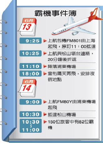 新华网消息 据台湾《联合报》报道,上海航空原订前天从上海飞松山的FM801班机,因途中遇雷雨,机长返航,延至14日才抵达,旅客被迫在上海多滞留一晚。飞机抵达松山后,80名旅客愤不下机,经民航部门斡旋才结束约半小时的霸机,也成为两岸直航以来首宗霸机事件。