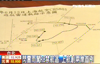 中新网6月16日电 据台湾TVBS报道,两岸直航以来发生第一次霸机事件,台当局民航部门拿出天气恶劣的数据替FM801班机背书,不过但同一份数据却掀开一个不能说的秘密,该班机“抄快捷方式”返航上海,回程穿越敏感的“R8禁航区”,成为两岸直航客机飞越军事空管区首例。
