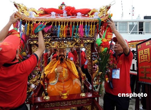 中新社福州六月二十八日电(记者 刘可耕)二十八日下午,由福州晋安区“闽台王审知研究会”组织的福州市闽王金身巡安台湾暨宗亲文化交流访问团一行圆满结束为期十天的闽王金身首次跨海巡安台湾本岛交流活动,搭乘“金龙轮”经“两马”航线返回福州。