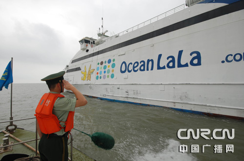 7月7日,台湾“海洋拉拉”号邮轮在边防官兵护送下驶离大麦屿客运码头,直航台湾宜兰。