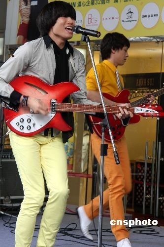 7月9日下午,获得“音乐风云榜”2008年度最佳摇滚乐队、有大陆“最具英伦气质乐队”之誉的“果味VC”,现身台北县贡寮海洋音乐祭启动记者会。图为该乐队主唱孙凌生(左)。 中新社发 董会峰 摄