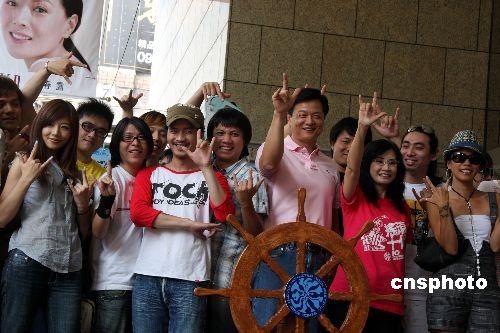 来自海峡两岸及香港、澳门等地的多个摇滚乐队,将从7月10日起一连3天在台北县贡寮海洋音乐祭上演唱。图为7月9日下午,台北县长周锡玮(前排右三)、县观光旅游局局长秦慧珠(前排右二)与众乐队成员,在音乐祭启动记者会上做出摇滚手势。 中新社发 董会峰 摄