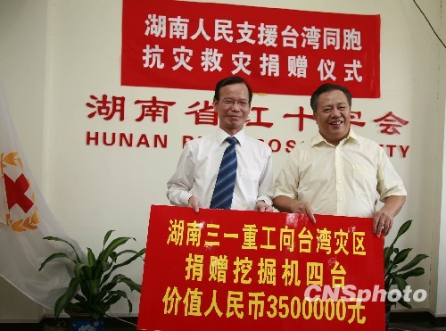 8月15日,湖南省红十字会为受台风重创的台湾南部灾区举行捐赠仪式,共收到来自湖南企事业单位、长沙及湘潭市政府的捐赠款物980万元人民币。其中,三一重工捐赠的价值350万元的工程机械设备成为此轮捐赠的最大一笔善款。 中新社发 肖前辉 摄
