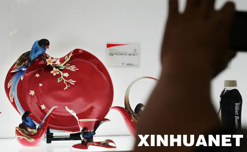 9月1日,参观者正在为台湾的陶器作品《鹊跃》拍照。
