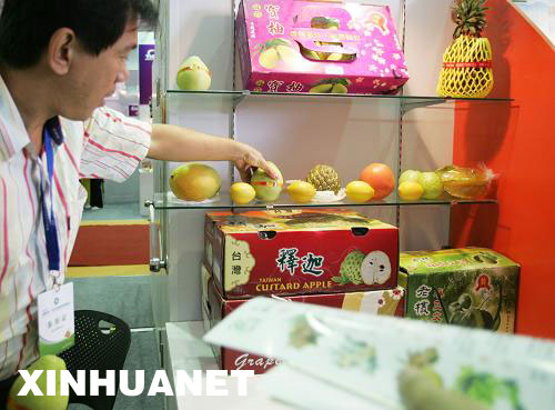 9月2日,一位展商在摆弄摊位前的台湾水果。