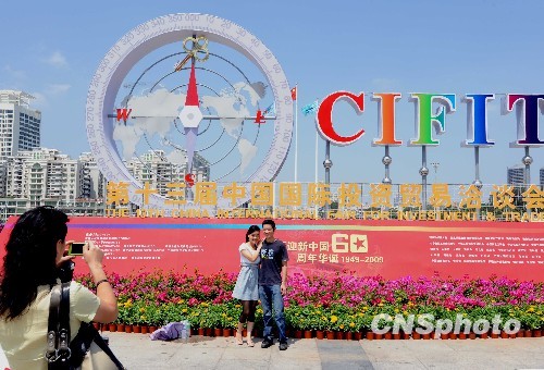 9月6日,市民在厦门国际会展中心的一处中国国际投洽会主题景观前合影。9月8日上午,第十三届中国国际投资贸易洽谈会将在厦门国际会展中心开幕。 中新社发 刘可耕 摄
