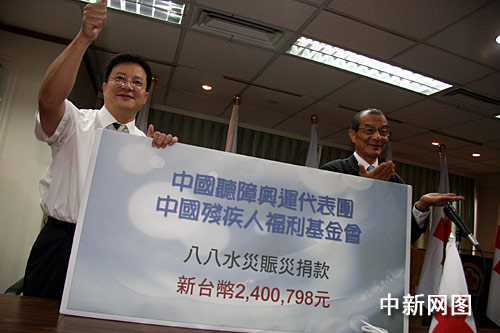 新华网台北9月8日电(记者陈键兴)正在此间参加第二十一届听障奥运会的中国代表团8日派员前往台湾红十字组织,送交代表团与中国残疾人福利基金会向台湾灾区的捐款2400798元新台币。