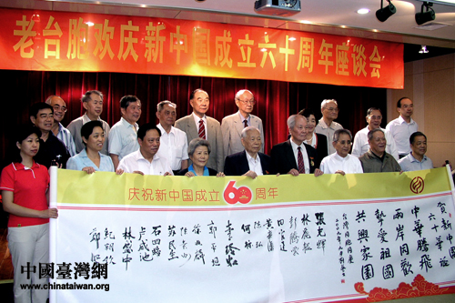 中国台湾网9月16日北京消息 在祖国即将迎来六十华诞之际,台胞纪念新中国成立六十周年座谈会在京举行。全国政协原副主席、全国台联名誉会长张克辉,全国台联首任会长林丽韫,全国台联原副会长田富达、郑坚等20余位在京台胞共聚一堂,用简朴却真诚的形式表达爱国爱乡的赤子情怀。