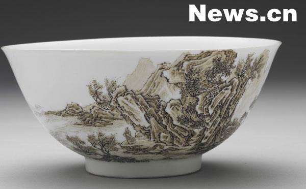 清 雍正 瓷胎畫琺瑯赭墨山水碗(图片由台北故宫提供)