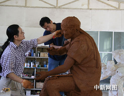 中新网徐州9月23日电(朱志庚)近日,中国台湾雕塑协会秘书长、著名雕塑家李宝龙来到江苏徐州,和中国雕塑专业委员会副秘书长、徐州籍著名雕塑家乔迁一起,为澳门回归十周年主题活动《爱我中华艺术大展》创作参展作品。今日,乔迁的作品《门巴族》雕像泥稿完成,李宝龙先生的作品《高山族》正在紧张创作中。