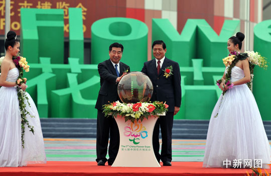 图为国务院副总理回良玉与中共北京市委书记刘淇共同出席花博会启动仪式。中新网记者 金硕 摄