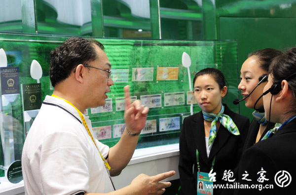 来自澳门的罗耀新乡亲反客为主,向澳门展区的解说员讲述澳币变化的故事。 徐波 摄影