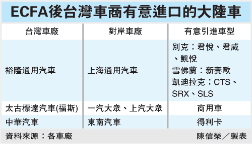 中国台湾网11月5日消息 两岸经济合作架构协议(ECFA)签署在即,未来大陆整车出口到台湾可享零关税优惠。台湾裕隆通用汽车昨日率先宣布,只要法令一开放,将进口上海通用汽车到台贩卖。台湾福斯汽车总代理太古汽车集团及中华汽车高层也透露,正研拟自大陆合作车厂,引进部分商用车来台贩卖。