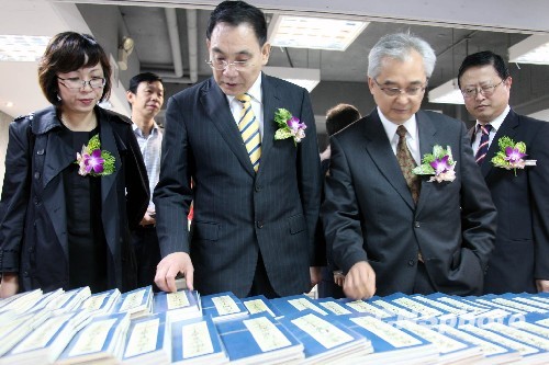 11月17日,包括当今中国出版界最珍贵、史学界公认最权威的二十四史版本《百衲本二十四史》在内,2000余种皖版精品图书17日起在台北市上海书店展出六天。图为率团访台的安徽皖台交流协会名誉会长臧世凯(左2)在参观书展之《百衲本二十四史》。 中新社发 黄少华 摄