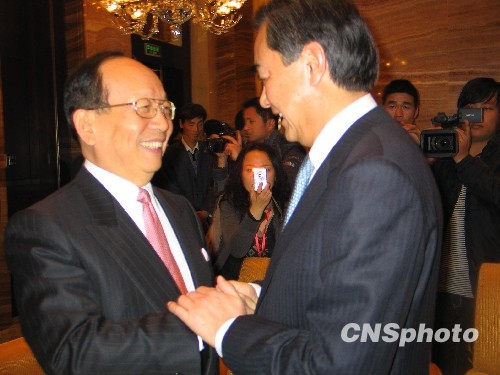 十八日晚间,中国国务院台办主任王毅在西安出席即将召开的海峡两岸(陕西)经贸科技合作大会,会见了到会的中国国民党副主席蒋孝严等一行。图为王毅与蒋孝严(左)亲切握手。 中新社发 冽玮 摄