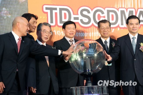 11月24日,中国电子工业标准化技术协会和中国通信标准化协会名誉理事长娄勤俭(右3),和台湾金仁宝集团董事长许胜雄(左3)等在台北共同按下启动球,宣告台湾威宝电信“TD-SCDMA试验网”正式开通。台湾TD试验网的开通,是落实海峡两岸信息产业技术标准论坛达成的共识,展示两岸在第三代移动通信系统TD-SCDMA技术、研发和产业化方面所取得的合作成果。 中新社发 黄少华 摄