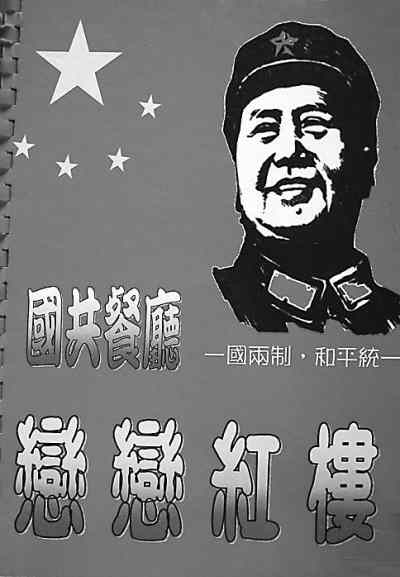 我在金门旅游时,几位年轻的邮友带我来到金门老街。这条老街据说已经有几百年的历史了,大部分店铺都保存着原有的风貌。这些店铺主要经营当地的土特产,比如金门贡糖、金门高粱酒、金门牛肉干、金门陈皮果,还有金门菜刀等,店铺也像古代的酒店一样,旗幡当街飘扬,两旁一盆盆的鲜花清香四溢,酒香花美,街道中央不时能看到百年的榕树,盘根错节。海风阵阵,这真是涛声依旧,又见千年的沧桑,百年的风雨,令人心旷神怡,不知今夕何夕。信步走来,我们想找个地方歇歇脚,喝喝咖啡。抬头一看,前面“国共餐厅”4个大字极为醒目,红旗飘扬,“走进新时代”的歌声清脆悦耳。我想:此时竟在何方,难道我们现在是在大陆吗?难道国共双方的代表曾在这里见过面吗?我们带着好奇心走进了餐厅,美丽的小姐说着流利的普通话,热情地欢迎我们,请我们入座,为我们沏茶,而且马上递给我们一个菜谱。这菜谱一看,全是红色,着军装的毛泽东像赫然在目,还有“一国两制,和平统一”的口号,还印着五星红旗。打开菜谱一看,有不少大陆的名菜,也有毛泽东喜欢吃的红烧肉、臭豆腐,真是令人激动!